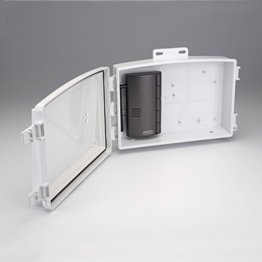 Устойчивый к внешним воздействиям шкаф, выполнен по стандарту NEMA 4X. Защитит от внешних воздействий следующие функциональные узлы станции: панель управления Vantage Pro2, Vantage Pro2 Plus , Vantage Vue , Envoy 8X и Weather Envoy ™, блок сопряжения датчиков или помехо-защищенную коробку-переходник, выходной сигнальный блок, регулятор из комплекта солнечной батареи.