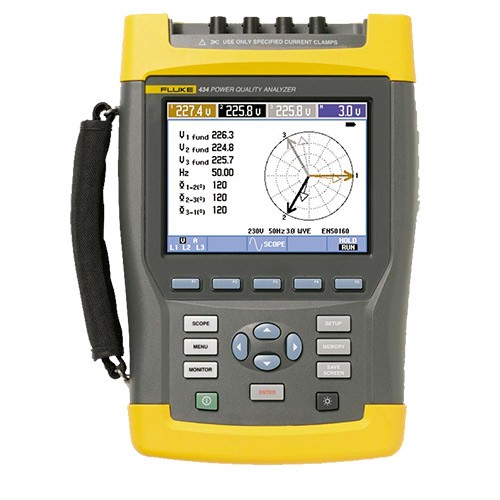 • Полнофункциональный прибор для наладки трехфазных сетей Fluke 434: измеряет буквально все параметры электропитания: напряжение, ток, частоту, мощность, потребление энергии, дисбаланс и фликер, гармоники и промежуточные гармоники. Регистрирует такие события, как провалы и выбросы, переходные процессы, прерывания и быстрые изменения напряжения.