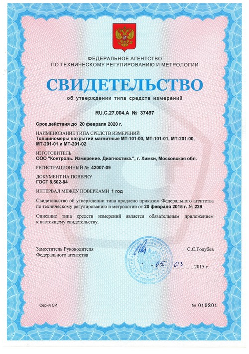 Магнитный толщиномер покрытий МТ-101М внесен в государственный реестр средств измерения под номером №42007-09, сертификат RU.C.27.004.A №37497.
