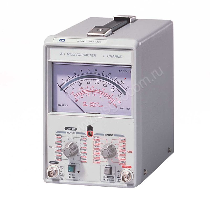 Вольтметр переменного тока GVT-427B: 2 канала измерения; Измерение среднеквадратического значения переменного напряжения синусоидальной формы на пределах от 300 мкВ до 100 В; Диапазон рабочих частот 10 Гц … 1 МГц; Измерение относительных уровней на пределах от минус 70 дБ до 40 дБ; Измерение относительных уровней в дБ и дБм; Выход широкополосного усилителя для каждого канала; Простота, компактность, надёжность; Масса 2,84 кг.