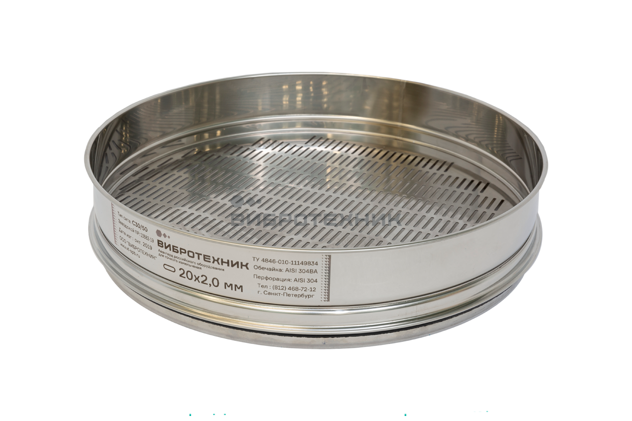 Сита лабораторные С 20/50 и С 30/50 состоят из обечайки, решета, соединительного элемента и резинового уплотнительного кольца. В месте крепления решета и на верхнем торце обечайки выполнены круговые буртики, а в средней части – зиг, обеспечивающие жесткость сита.