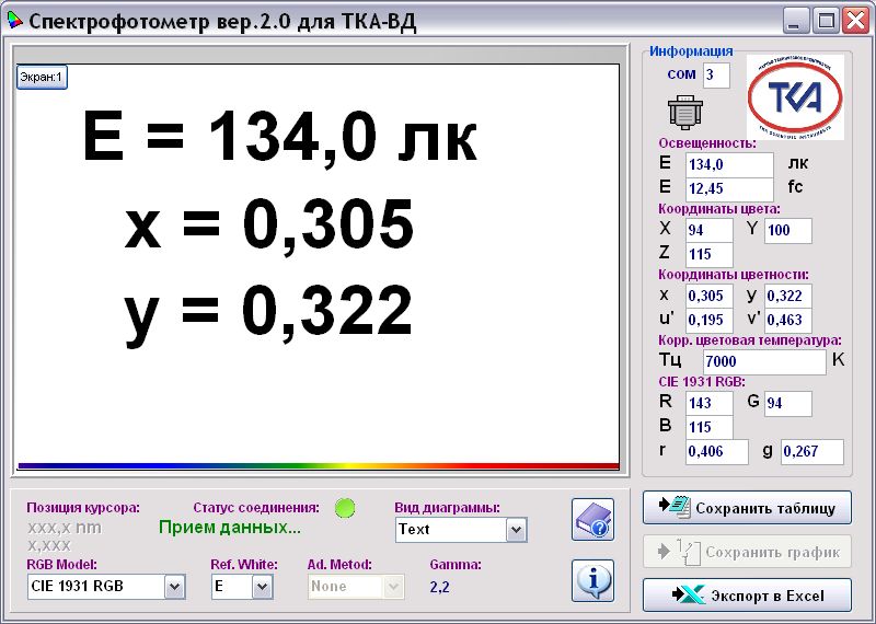 1 Отображение освещённости Е, лк и координат цветности (x, y) в системе МКО 31