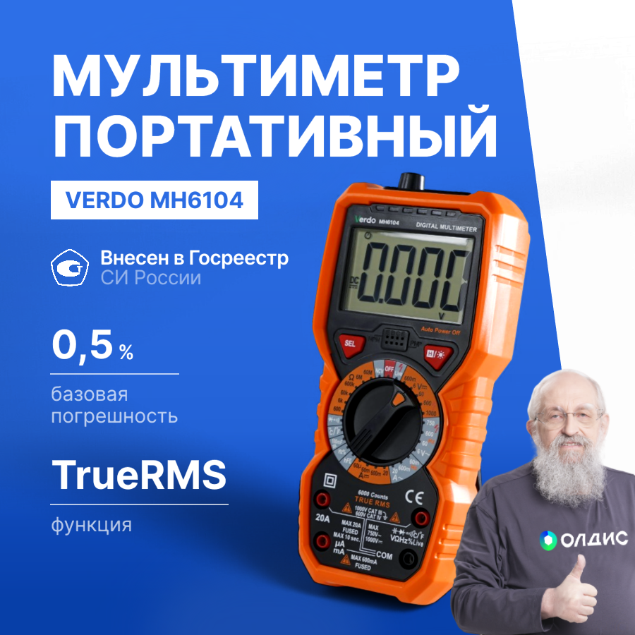 Мультиметр VERDO MH6104 – это ручной цифровой мультиметр с функцией отображения истинного среднеквадратичного значения (TrueRMS) и большим жидкокристаллическим дисплеем с подсветкой, и фонарем, что облегчает считывание показаний. Мультиметр оснащен функцией защиты от перегрузки и индикатором разряженной батареи. Этот многофункциональный измерительный прибор идеально подходит как для профессионального использования на производстве, ремонта и сервисного обслуживания, так и для обучения и бытового применения.