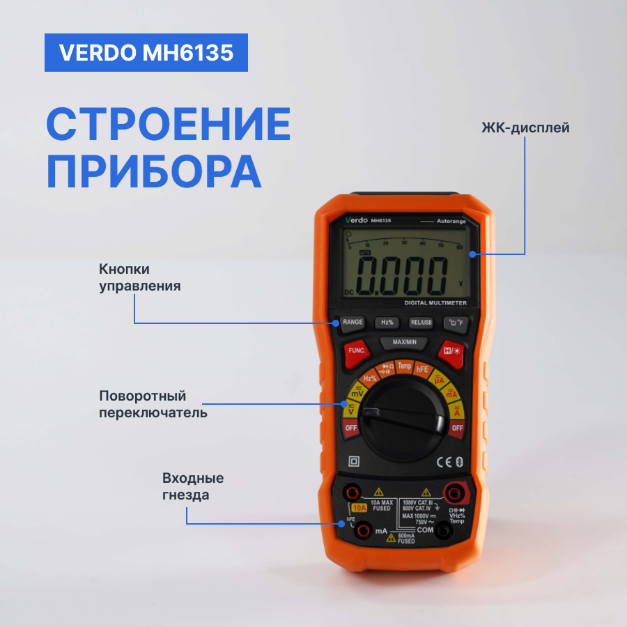 Мультиметр VERDO MH6135 – это многофункциональный ручной цифровой мультиметр с функцией отображения истинного среднеквадратичного значения (TrueRMS), большим многострочным жидкокристаллическим дисплеем с аналоговой шкалой, что облегчает считывание показаний. Передача измеренных значений величин в ПО обработки. Этот многофункциональный измерительный прибор идеально подходит как для профессионального использования на производстве, ремонта и сервисного обслуживания, так и для обучения и бытового применения.